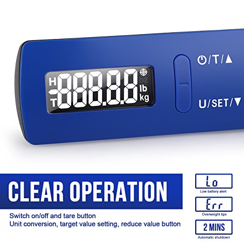 ❤ EASY TO USE – LCD Blue backlit function makes luggage weighing scale is easy to read in darkness or under the strong sunlight, Unique weighing hook position design, more convenient to weigh