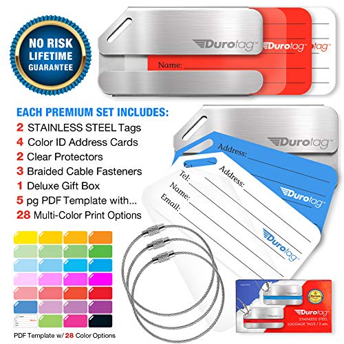 CREATE YOUR OWN UNIQUE, CUSTOM LOOK. Each set includes 2 luxury metal tags, plus 4 different colorful ID cards – choose between red, blue, and 2 white labels. For even more options receive a printable PDF template by email. Stand out from the crowd, in style.