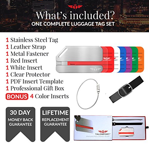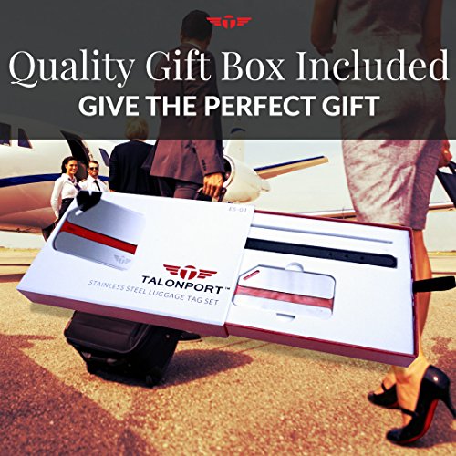 You’ll instantly stand out from the crowd with your Talonport executive series metal luggage tag! Easily spot your bag and stop the chance of losing it with your personalized bag tag. Designed with your privacy in mind, your personal details are hidden away. Quality Stainless Steel Metal Luggage Tag The Talonport metal luggage tag is crafted with high quality stainless steel, much stronger than aluminum from which most other metal luggage tags are made of. Don’t settle for less – buy a quality product that will last for years to come. What’s Included With Your Bag Tag? – You get two options of inserts which you can easily personalize with your contact details. One in stand-out-red and one in simple white. – Both a leather strap and steel ring are included for your choice of connecting the tag to your bag or luggage. – You’ll get a PDF template so you can always create your own if you need to. – You’ll also receive a high quality retail package making it a perfect item to give as a gift. First Class Customer Service and Lifetime Guarantee We stand behind our products 100%.If for any reason you’re not happy, we’ll give you a no hassle 100% refund within 30 days of purchase. Plus, if your Talonport luggage tag is ever lost with your bag, we’ll immediately ship you a replacement! First class customer service is what we’re renowned for. Buy Now If you love quality travel accessories, you’ll love your new Talonport metal luggage tag. Quantities may be limited at times. Add yours to your cart today! The Talonport metal luggage tag is manufactured and sold exclusively by Talonport and it’s authorized dealers. All listing text and photos copyright Talonport.