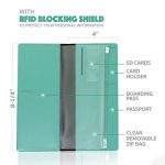 QUALITY IN DETAILS. Made of Premium PU Leather (Vegan friendly) along with Rfid blocking anti-skimming shield material to help protect your passport and cards. Passport cover dimensions are 4 X 8-1/4 x 3/8 inches. Plastic pouch dimensions are 3 X 8 inches.