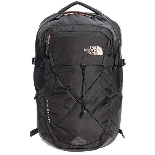 The North Face – Women’s Solid State Laptop Backpack – Black/Rose Gold The women-specific FlexVent suspension system boasts compression-molded shoulder straps and a padded mesh back panel with a spine channel that’s specifically shaped for an ergonomic fit Women-specific shoulder straps with flexible attachment points are contoured for a womens torso for a perfect fit for any size or shape Floating padded laptop sleeve in main compartment protects laptop from bumps and falls Secondary compartment has internal organization with a secure zippered pocket, Velcro pocket and pen pockets Reflective bike-light loop, reflective water bottle tabs and reflective shoulder strap webbing create 360 degrees of reflectivity