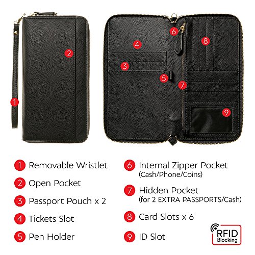 GREAT SIZE – fits multiple passports (up to 4), tickets, money, travel documents, 6+ credit cards, pen, ID card or driver’s license, phone. Excellent for solo trip or trip with kids and family