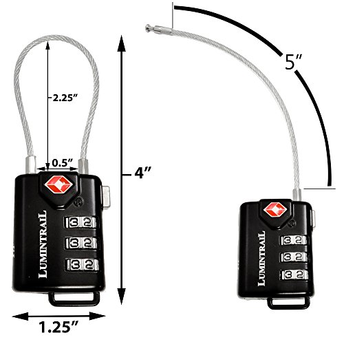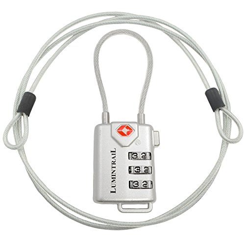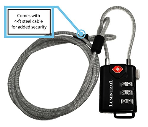 The Lumintrail 3 digit personalized combination lock with steel cable is a unique lock and cable combo and is the perfect solution for securing bags to a fixed object or securing them together, or securing zip pulls. The cable is 4-ft long and made of coated steel, ensuring long-lasting durability.