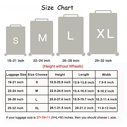 COVER SIZE:S: fit 18-21 inch luggage, M: fit 22-24 inch luggage, L: fit 26-28 inch luggage, XL: fit 29-32 inch luggage.Elastic luggage cover fit most major luggage brands,make your suitcase recognize instantly.