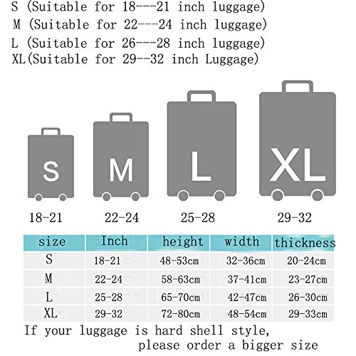 S (Suitable for 18—20 inch luggage) ,M (Suitable for 22—24 inch luggage), L (Suitable for 25—28 inch luggage),XL(Suitable for 29–32 inch Luggage),If your luggage is hard shell style, please order a bigger size.